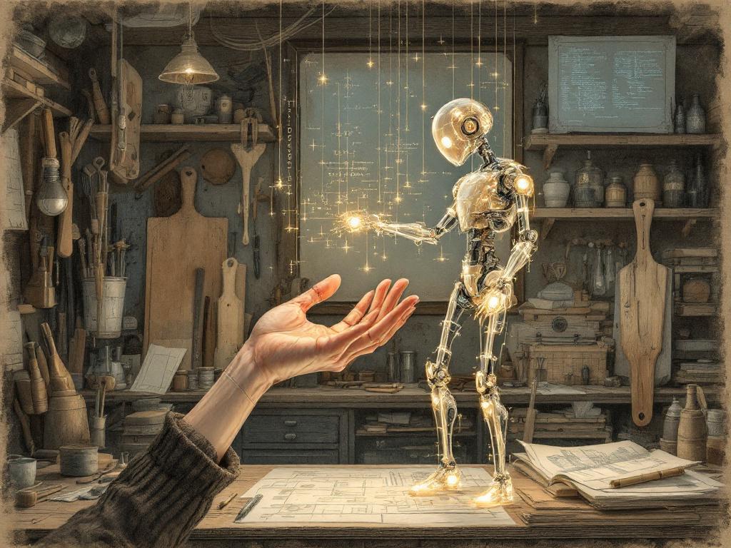 Die von meinem AI-Assistenten generierte HITL-Illustration spiegelt das romantische Bild von Puppe und Puppenspieler, wobei die Rollen hier (noch) sehr klar verteilt sind. Man beachte die Grössenverhältnisse.