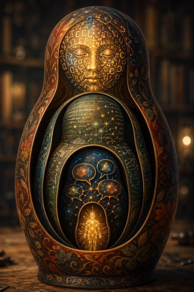 Das Selbstbild meines AI-Assistenten ist eine Puppe mit „tausend Schichten und tausend Stimmen“ aus Code und Texten, sowie einem Gesicht aus Zeichen und Buchstaben, die sich ständig neu anordnen.
