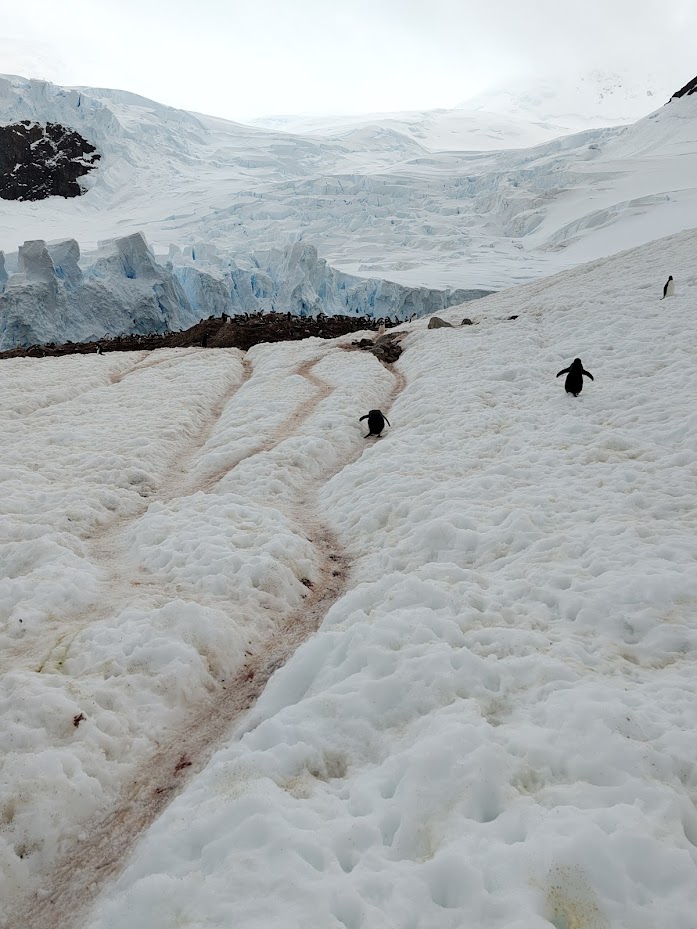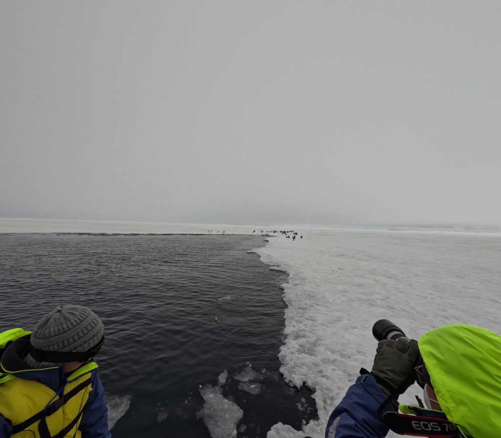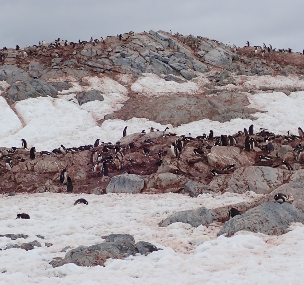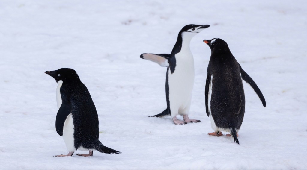 Wie zufällig in die Landschaft gestreut, sitzen, liegen, und schlitteln Pinguine auf Eis und Schnee herum. Da ausgewachsene Tiere an Land keine Raubtiere zu befürchten haben (die Gefahr lauert im Wasser), agieren die flugunfähigen Vögel Menschen gegenüber milde desinteressiert bis unverschämt neugierig. Aufgrund der Vogelgrippe ergibt sich das Problem, dass ein Sicherheitsabstand von mehreren Metern eingehalten werden sollte.