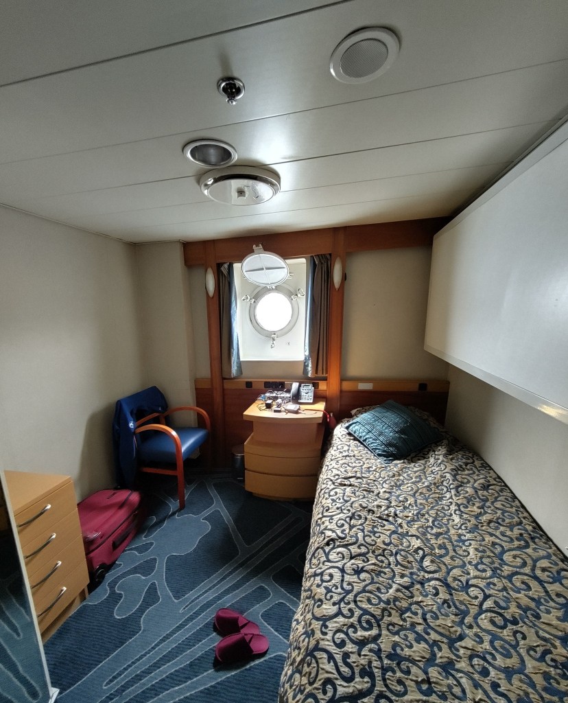 Ich habe eine Einzelkabine mit Bullauge in einem der unteren Decks. Zu jeder Kabine gehört ein kleines Badezimmer und clever angelegter Stauraum – Kein Zentimeter des wertvollen Platzes auf dem Schiff bleibt ungenutzt.