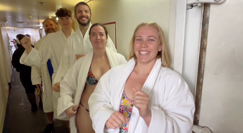 Der Polar Plunge! Die sprichwörtlich coolste Challenge der Welt findet traditionell in den eisigen Gewässern des Südpolarmeer statt. Die Wassertemperatur, so berichtet uns ein Crewmitglied freudestrahlend, beträgt -0.5° Celsius.