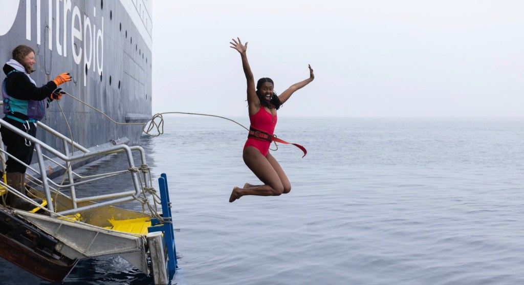 Grenzenloses Erstaunen über die blaue Welt unter Wasser, viele Luftblasen, Desorientierung, ein Schwindelgefühl. Kalt wird mir erst als ich wieder auftauche. Während ich versuche, so schnell wie möglich aus dem eiskalten Wasser zu kommen, bin ich froh, den Rat beherzigt zu haben, nicht zu weit raus zu springen. Ich klettere zitternd die Gangway hinauf, lasse mich in meinen Bademantel einwickeln und nehme dankbar den mir gereichten Wodka entgegen. Das Adrenalin kämpft mit den Endorphinen um die Vorherrschaft in meinem Nervensystem und verliert – ein breites Grinsen zeigt sich auf meinem Gesicht.