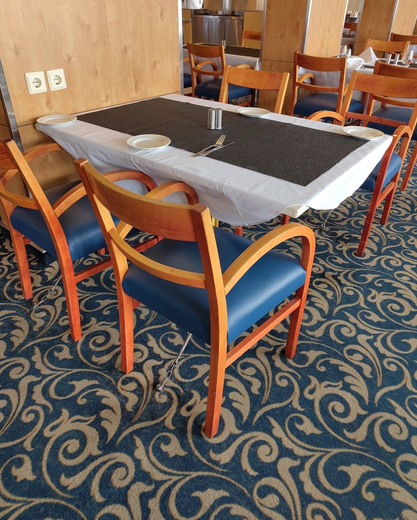 Das Leben an Bord hat seine Tücken, denen mit Antirutschmatten auf den Tischen und am Boden verschraubten Möbeln entsprochen wird.