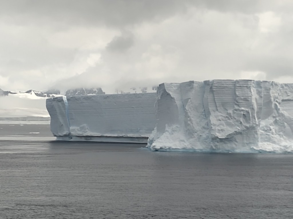 Es wird ehrfürchtig still an Board, als der Tafeleisberg an uns vorbeizieht. Er hat bereits die Grösse einer kleineren Parkanlage. Weitere Eisberge, die wir in der Folge sehen werden, haben die Ausmasse einer Kleinstadt. Unser argentinischer Glaziologie Santiago gibt uns einen – nicht wörtlich zu nehmenden – Crashkurs: