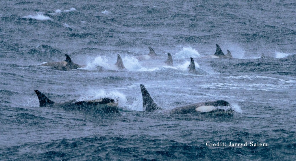 Der frühstückende Buckelwal am frühen Morgen war ein Bartenwal, also ein Filtrierer. Dann gibt es noch die Zahnwale, die, wie der Name sagt, keine Barten haben, sondern Zähne. Einmal beobachten wir eine Gruppe von 13 Orcas, wie sie Jagd auf Pinguine machen. Pinguine haben es wahrlich nicht leicht, denn aus der Sicht vieler Räuber haben sie die „perfect snack size“. Ein Orca frisst pro Tag 20 bis 30 Pinguine.